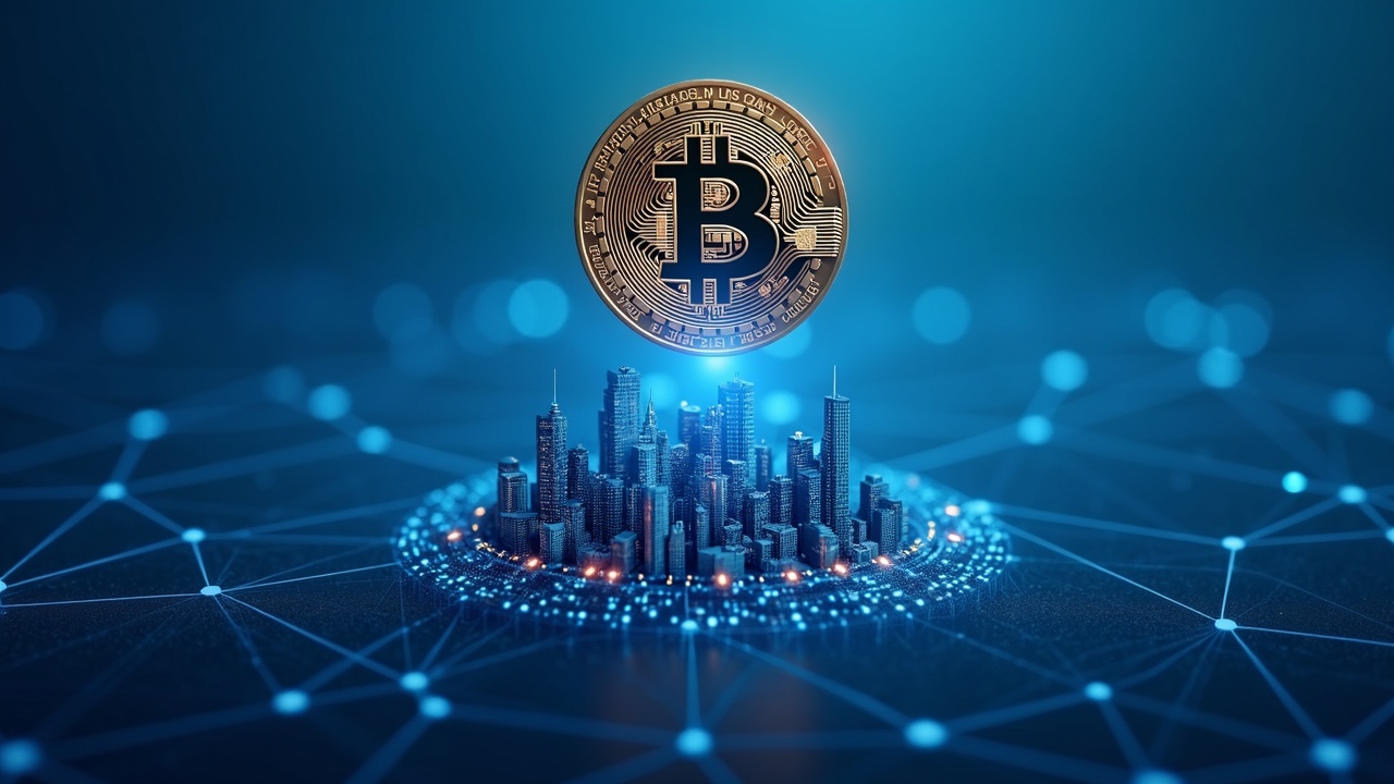 Photorealistic Bitcoin coin rising above a blockchain city with DeFi dashboards and tokenized assets, blue-toned.
