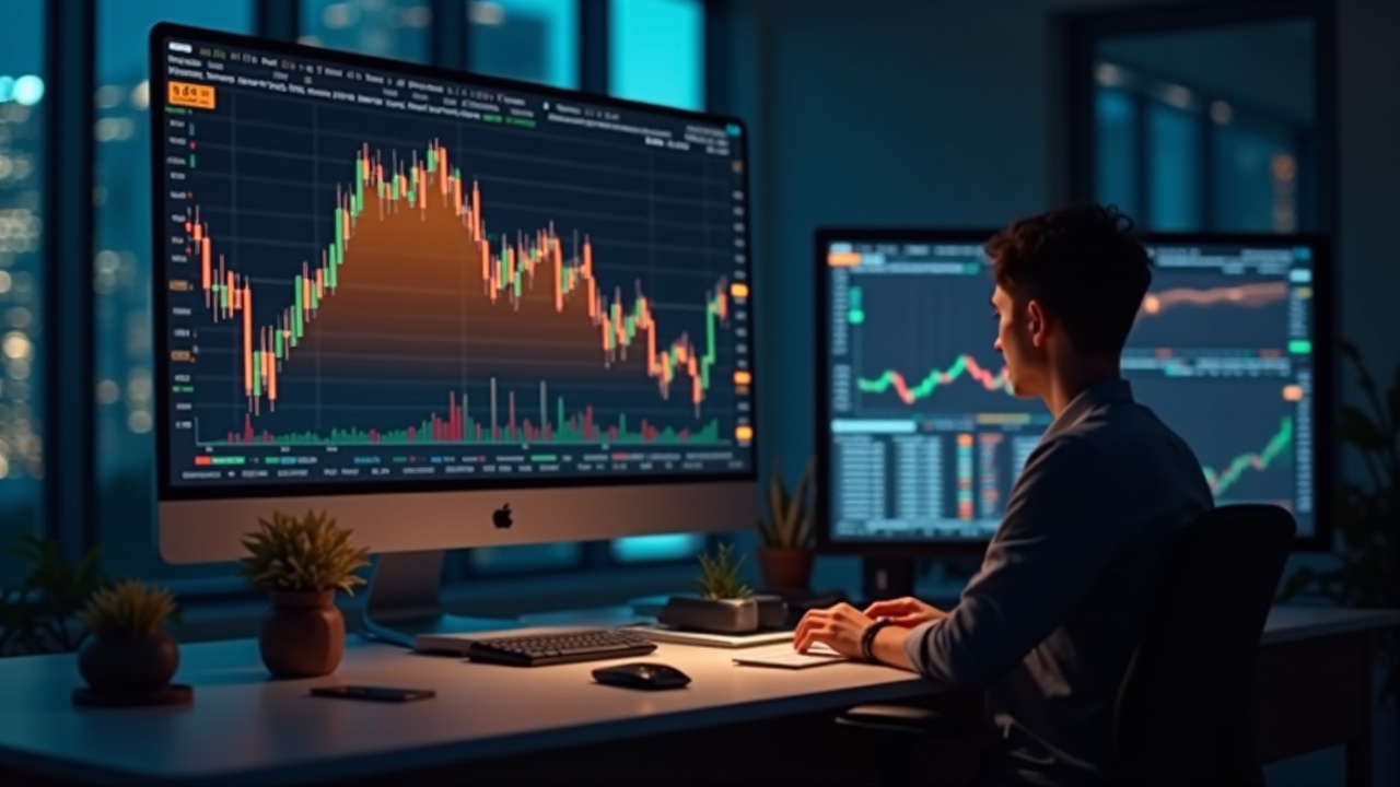 Photoreal crypto trading desk in Singapore with Bitcoin icon and a glowing price chart under 86k, Fed rate-cut odds.