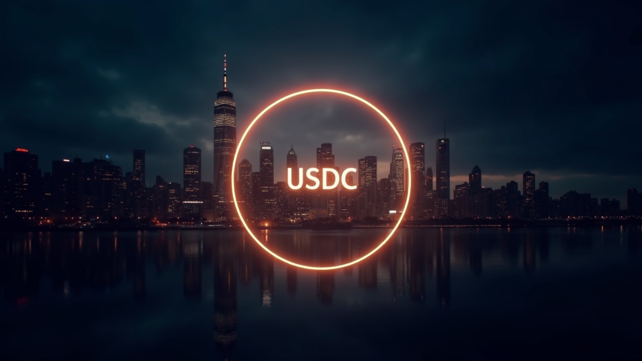 Photorealistic USDC circle glows, linking two world city skylines via a cross-chain network.