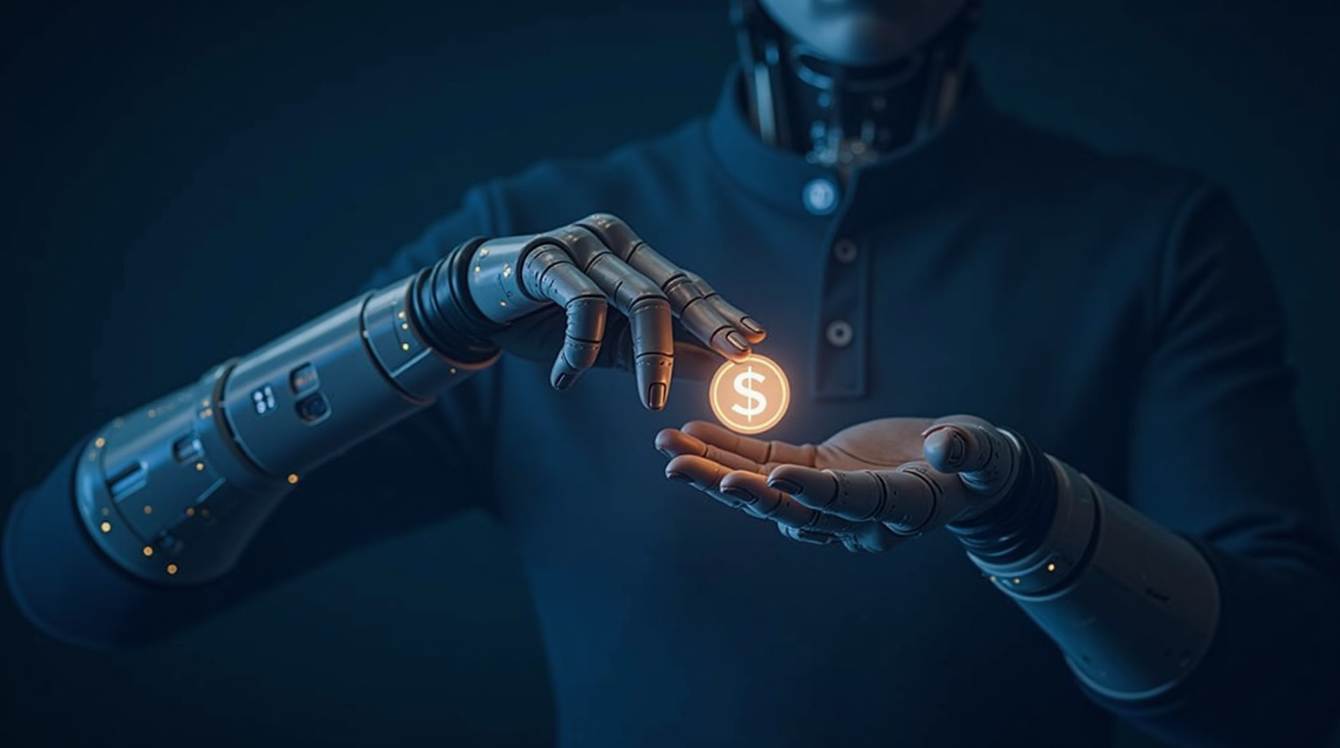 AI agent makes a payment with NET Dollar currency over a digital network, symbolizing instant micropayments and open protocols.