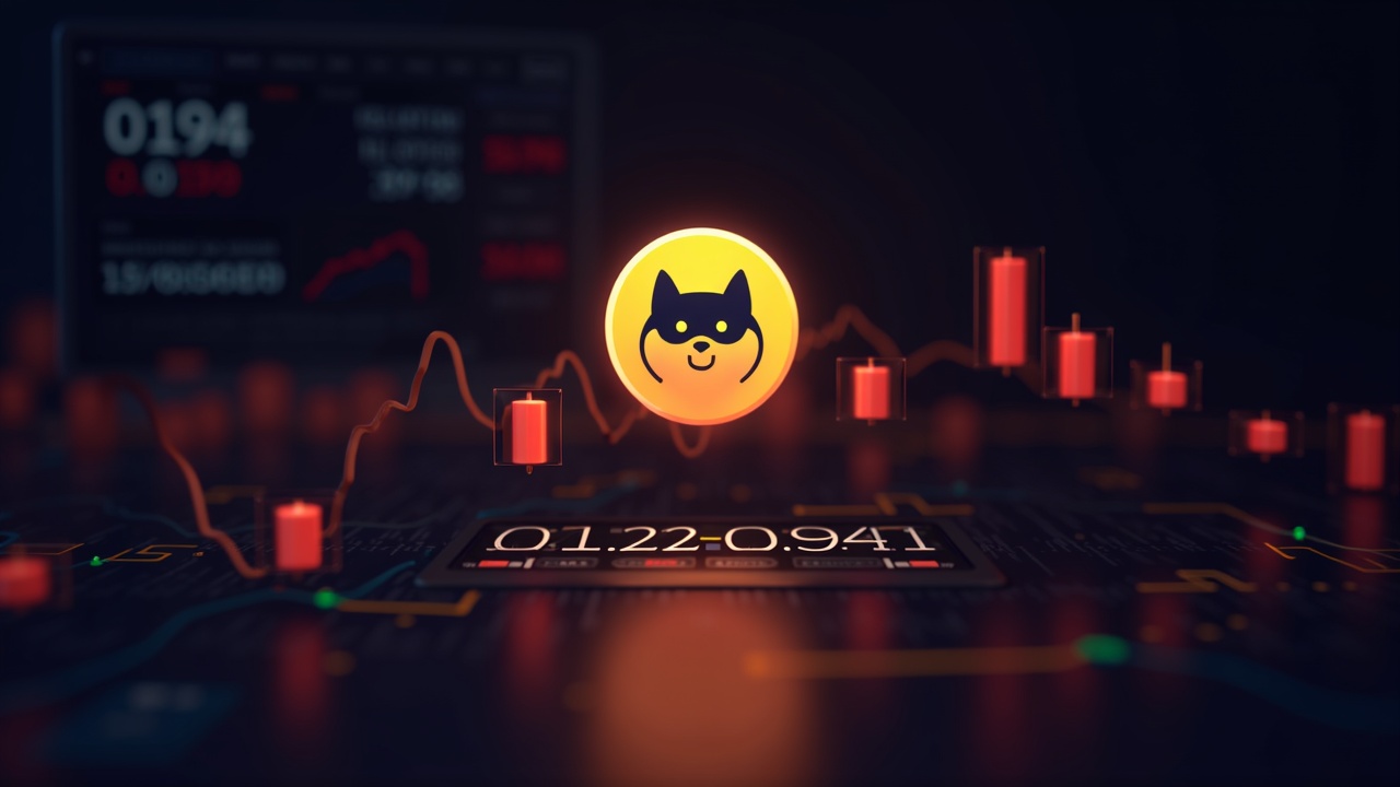 Photorealistic crypto scene: Dogecoin centered next to 0,192–0,194, Bitcoin falling, red candles and volatility screens.