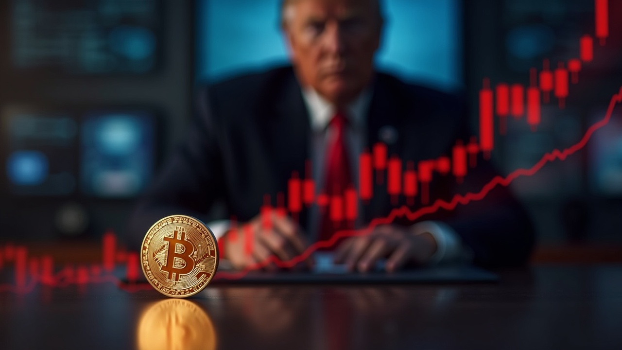 Mesa de trading cripto en primer plano con Bitcoin, figura oscura vinculada a Trump y gráfico rojo de posición corta.