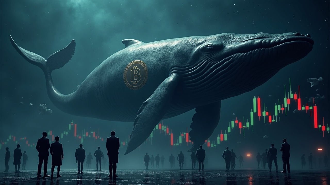 Ballena de Bitcoin fotorealista sobre tablero de mercado, BTC por debajo de 100k y caída del 7% con inversores al frente