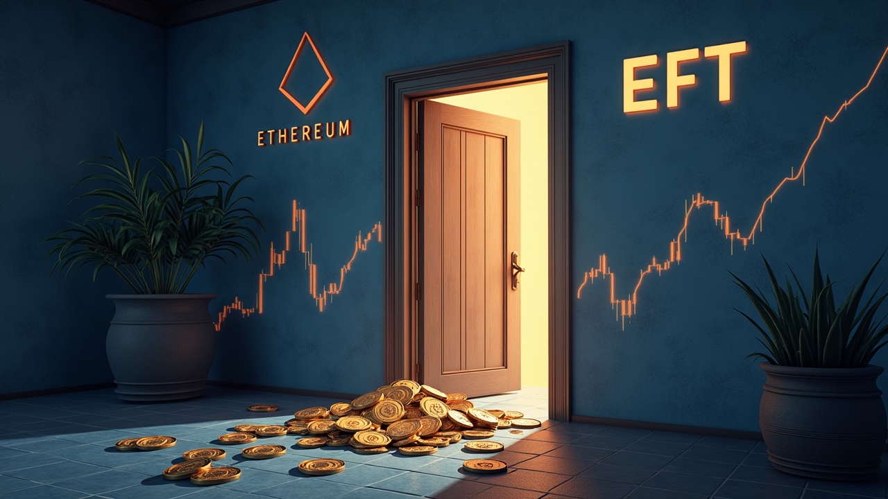 Balance de Ethereum derramándose, puerta estilo Hotel California y logo de BlackRock sobre un exchange.