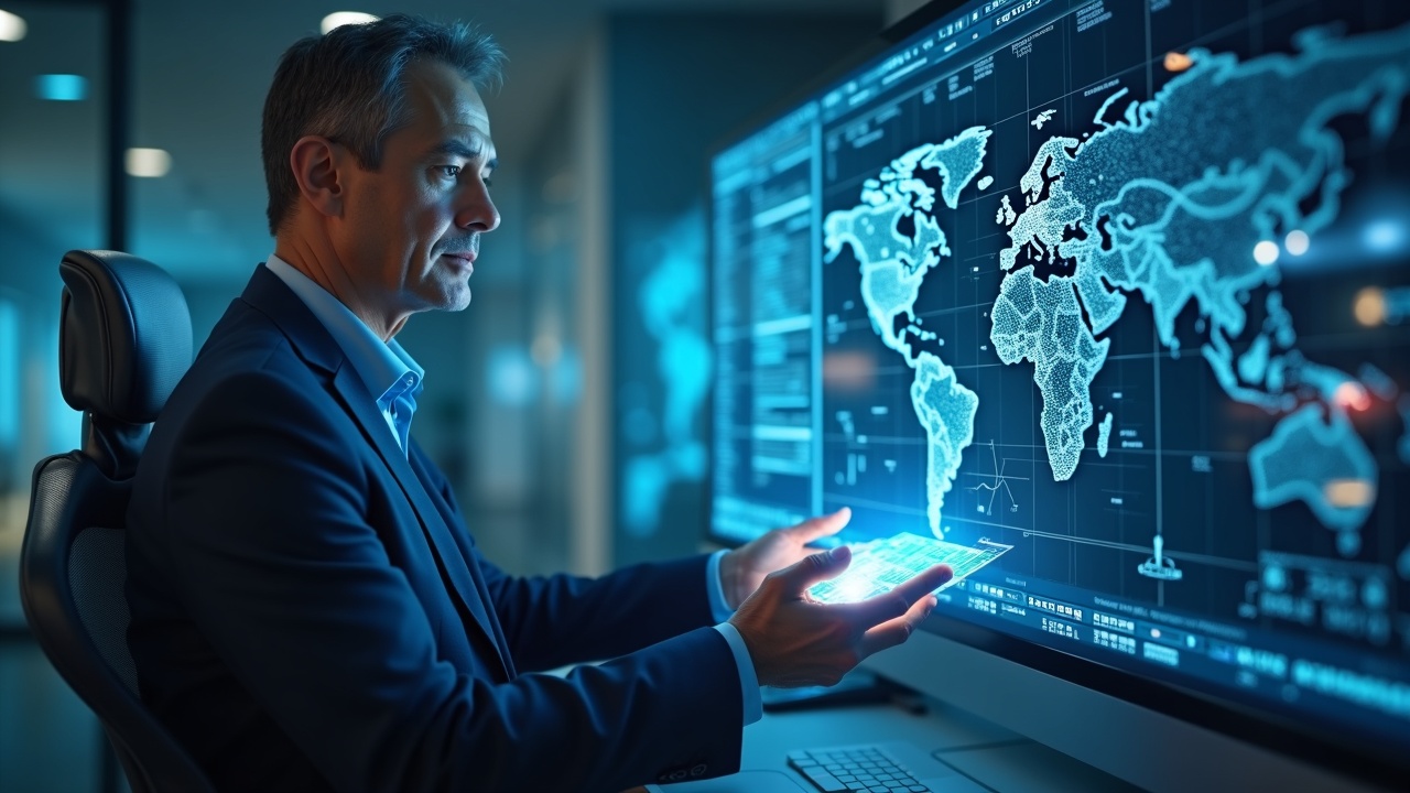 Un inversor institucional sénior revisa los dividendos en cadena en una pantalla holográfica con un mapa de red multicadena.