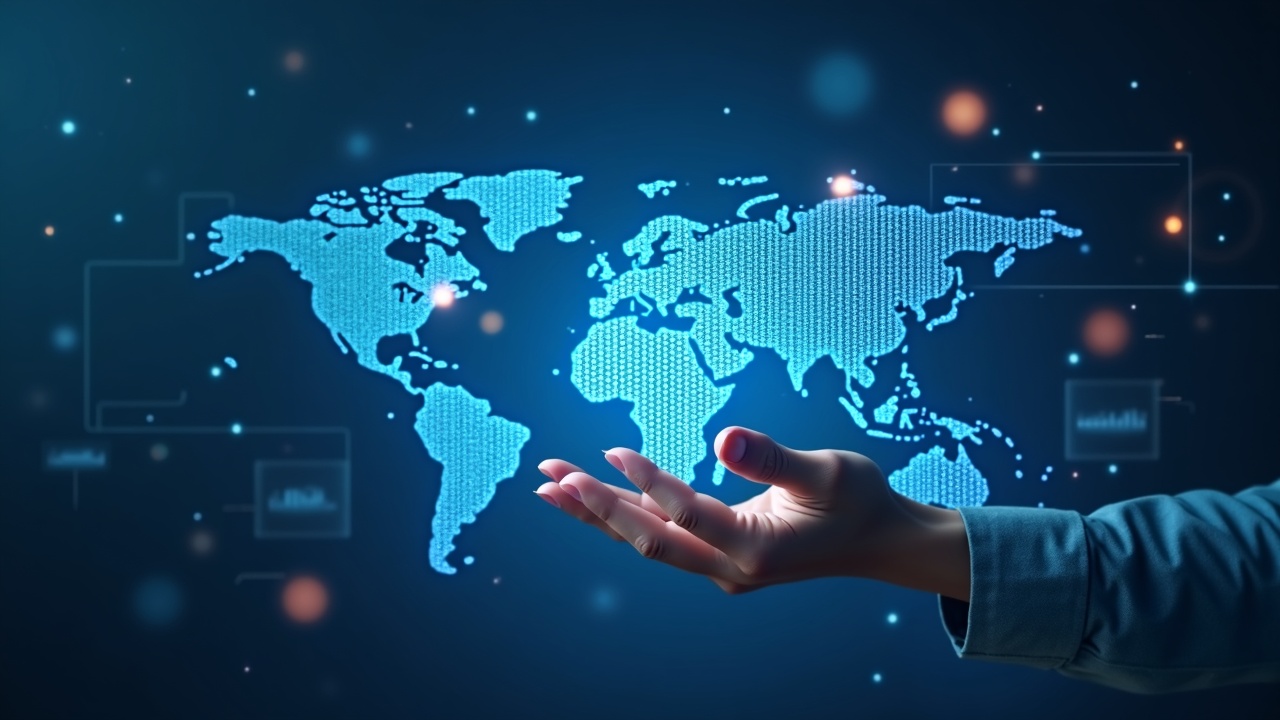 Una persona interactúa con un panel holográfico de Web3; redes intercadena orbitan un mapa global con mercados impulsados por IA.