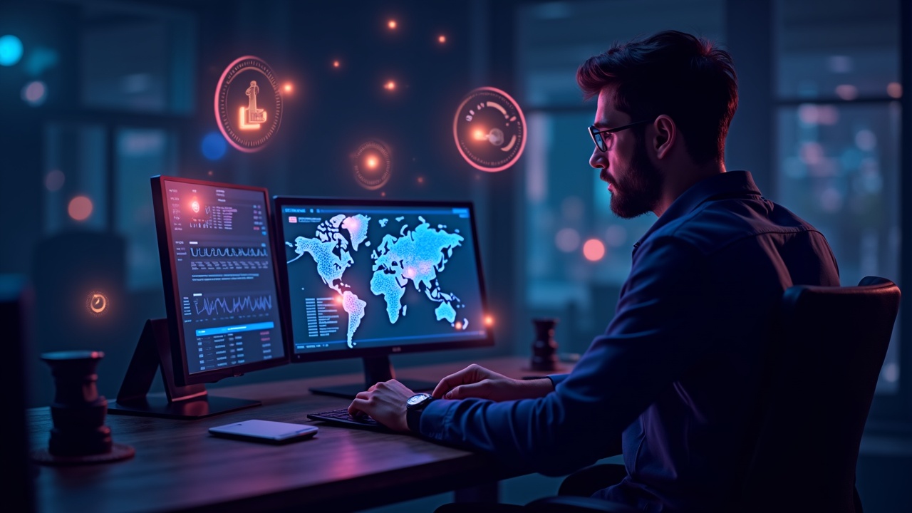 Trader frente a pantalla con memecoins, sellos regulatorios sobre un mapa de red descentralizada.