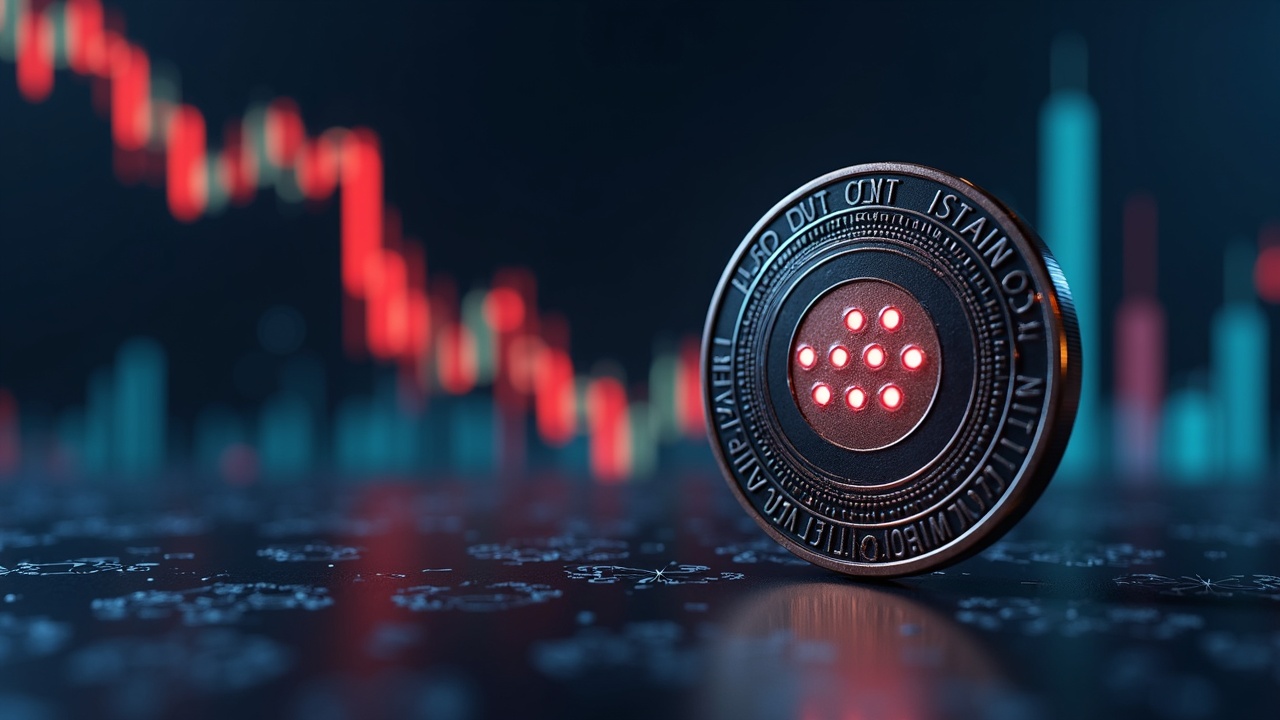 Token DOT de Polkadot fotorrealista en primer plano con una tendencia bajista que se desvanece y barras de liquidez delgadas bajo una iluminación fría de sala de redacción.