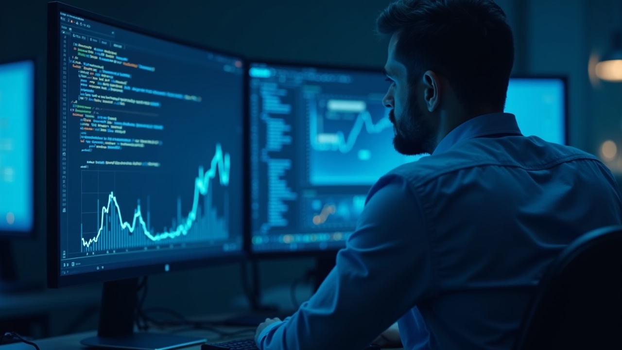Escena de sala de redacción fotorrealista con un analista de seguridad, código Truebit brillante en la pantalla, trazas del drenaje de ETH y un gráfico azul de curva de bonding.