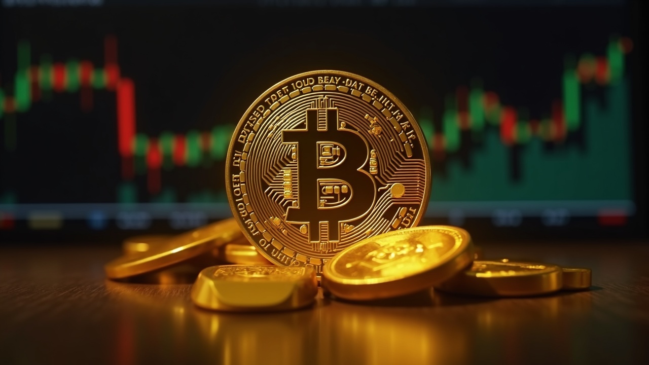 Bitcoin hiperreal en primer plano, barras de oro y gráfico de mercado digital, iluminación tipo noticiero.