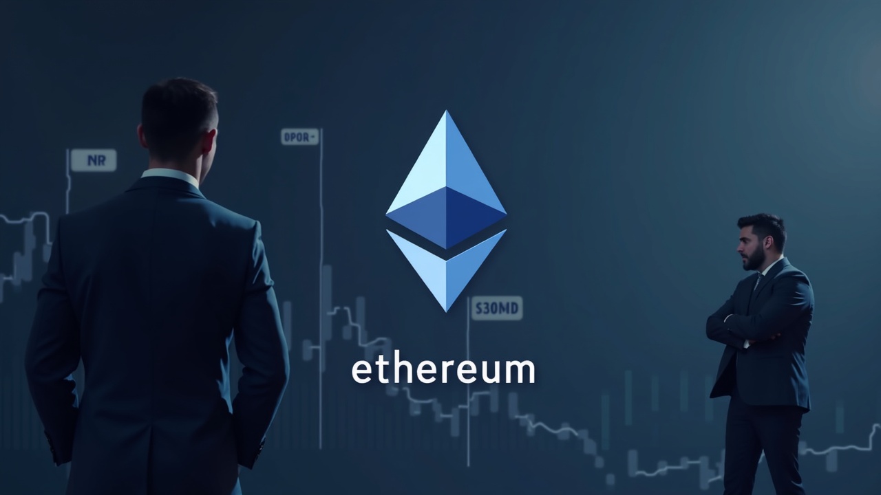 Logotipo de Ethereum con una ballena en ascenso, un marcador de la caída y una figura institucional cautelosa en una elegante escena de sala de prensa.