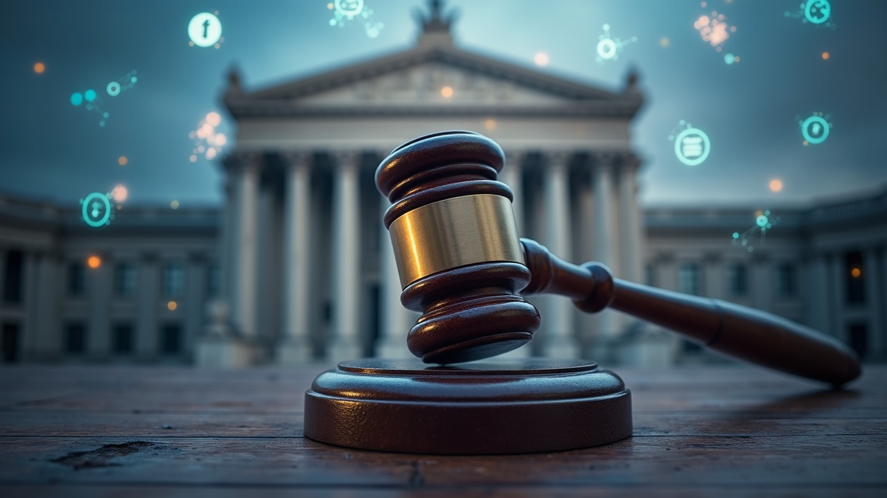 Fachada del tribunal de Londres con iconos de activos digitales y un mazo simbolizando la acción de la FCA contra HTX