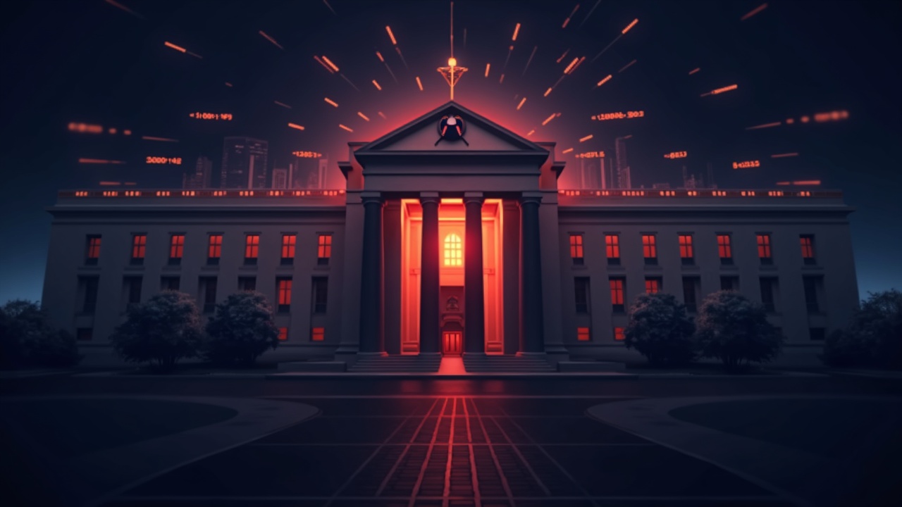 Fachada de la Fed en primer plano con halcón rojo, símbolos de criptomonedas y resplandor de blockchain.