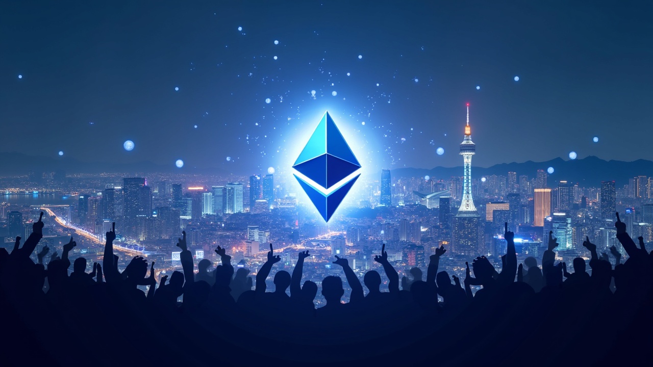 Horizonte futurista de Seoul con el logotipo de BitMine y el emblema de Ethereum, una multitud de inversores minoristas y gráficos criptográficos en ascenso.