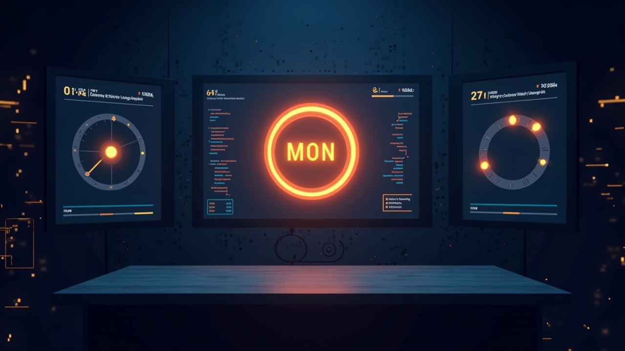 Sala de control fotorealista con glifo MON brillante, flujos de datos y candados que ilustran suministro bloqueado frente al circulante.