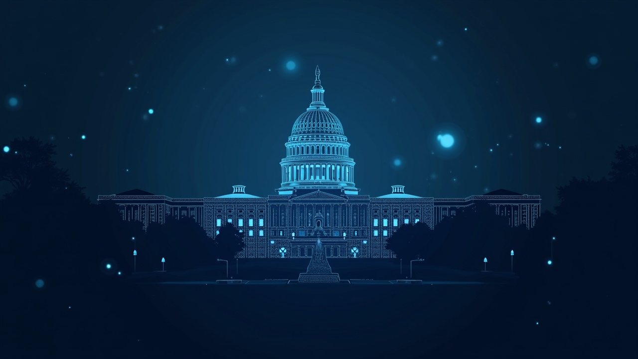 Silueta de edificio gubernamental con malla digital y símbolos criptográficos, simbolizando bloqueo político y reapertura temporal