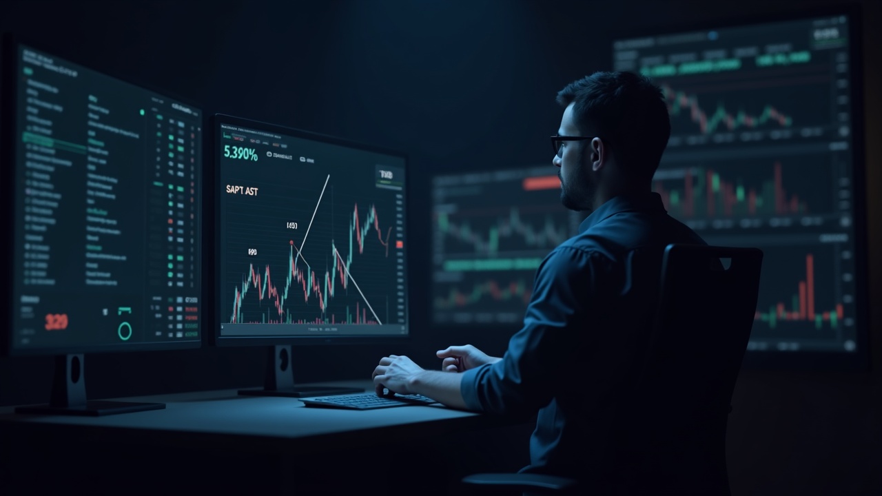 Sala de redacción cripto fotorrealista con un operador analizando el gráfico de Aptos APT, barras de volumen y soporte en 1.69 / resistencia en 1.72.
