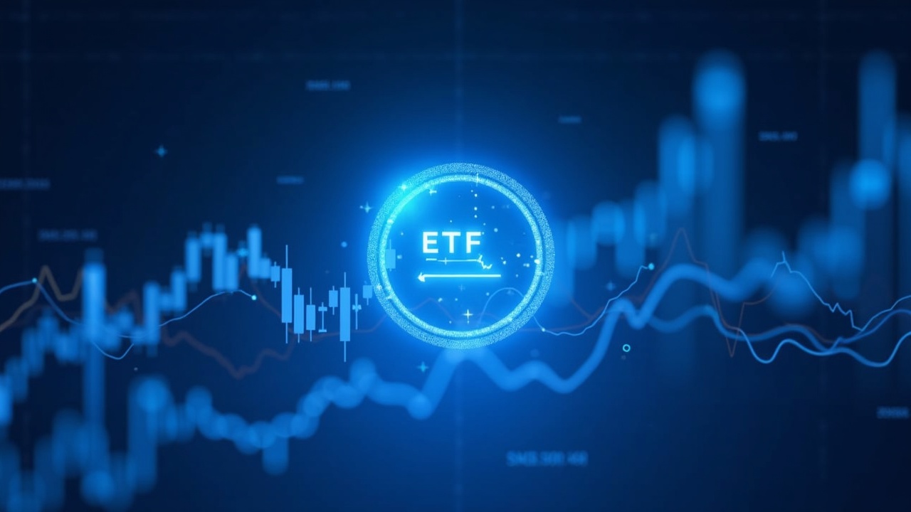 Logotipo de Solana en el centro con flechas de ETFs en alza y gráficos holográficos de precios, estética newsroom cripto azul.