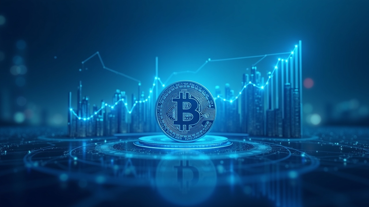 Encabezado periodístico fotorrealista con Bitcoin central, gráficos en alza y siluetas de ETFs en tonos azules.