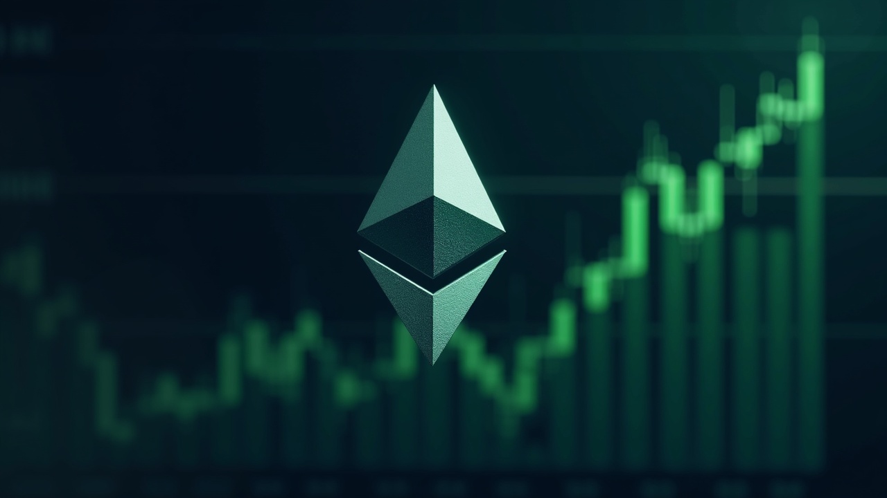 Photorealistic Ethereum logo over a rising crypto chart showing a cup-and-handle breakout with green volume bars