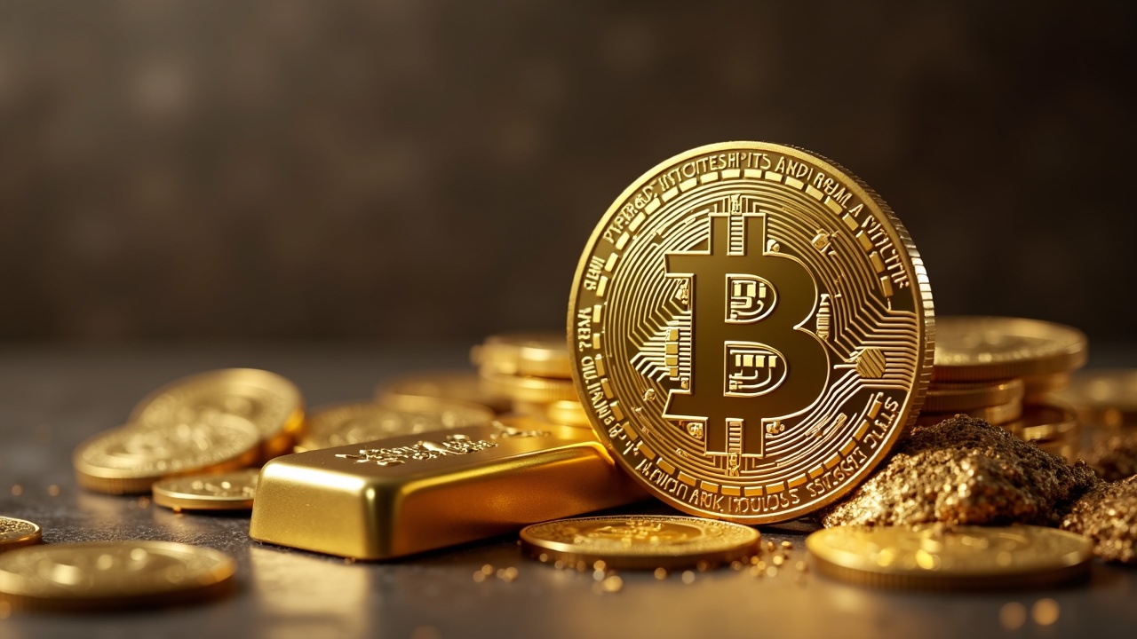 Photorealistic scene: Bitcoin and gold bar in a newsroom, highlighting a possible eight-week echo and sovereignty.