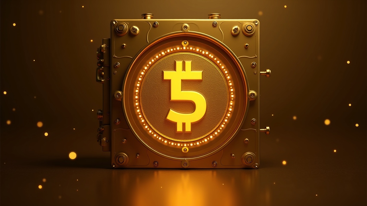 Photorealistic gold vault with a holographic USD symbol and blockchain nodes, signaling sovereign real-asset stablecoins.