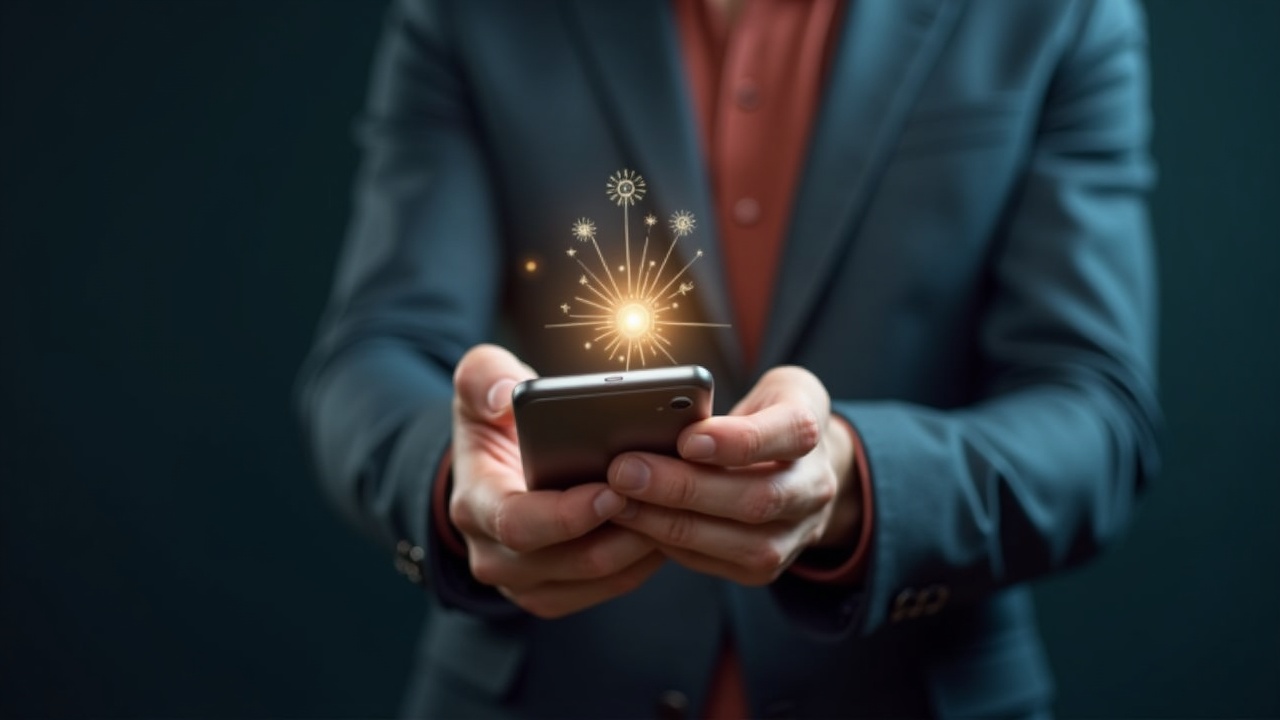 Photorealistic person holding a smartphone with glowing AI metaphysical glyphs on the screen
